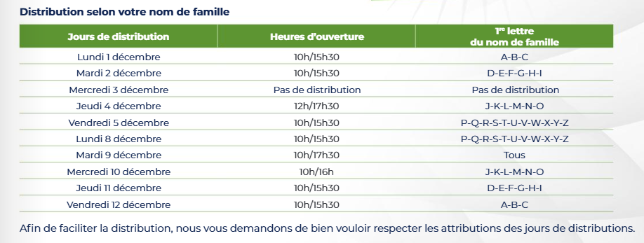 - Pas de distribution le mercredi 3 décembre (journée récréative).