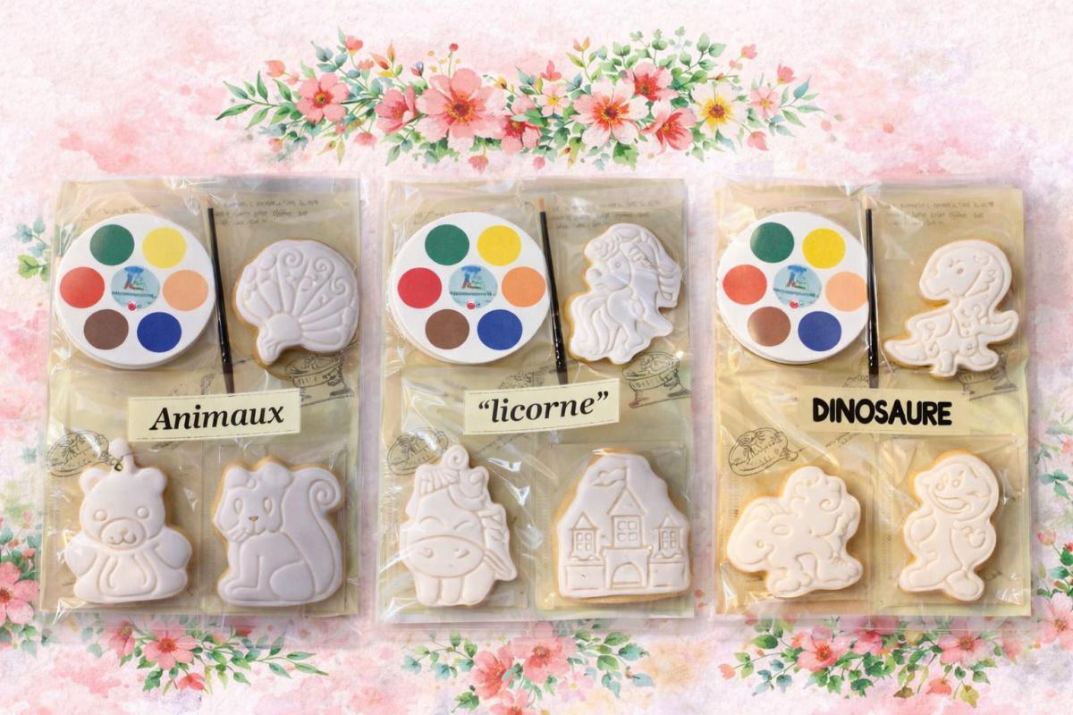 Pour les enfants, Aurore a imaginé des packs de sablés à peindre, ludiques et gourmands, déclinés sur différents thèmes : animaux, Pokémon, licornes, princesses, et bien d’autres.