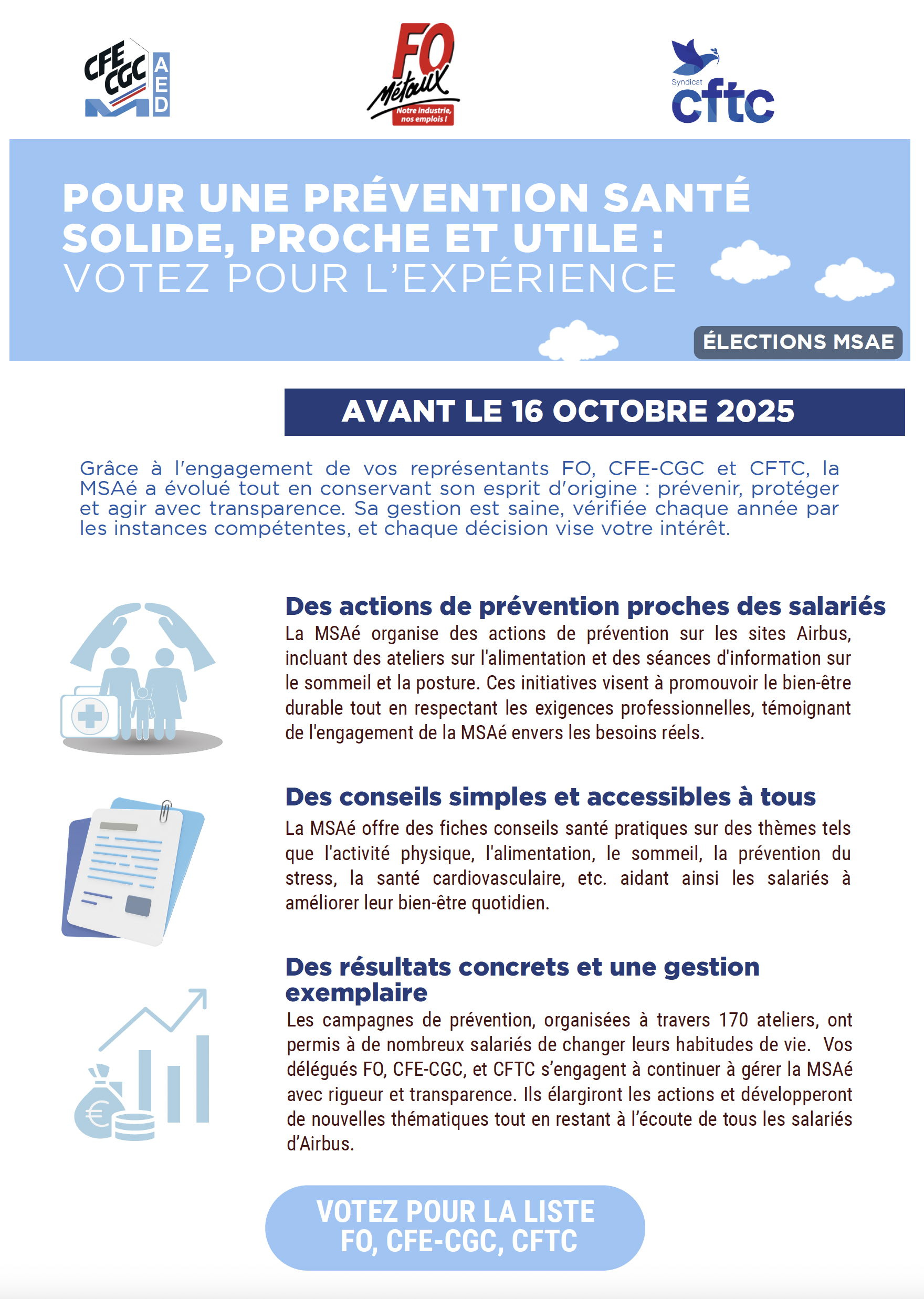 Grâce à l'engagement de vos représentants FO, CFE-CGC et CFTC, la MSAé a évolué tout en conservant son esprit d'origine : prévenir, protéger et agir avec transparence. Sa gestion est saine, vérifiée chaque année par les instances compétentes, et chaque décision vise votre intérêt.