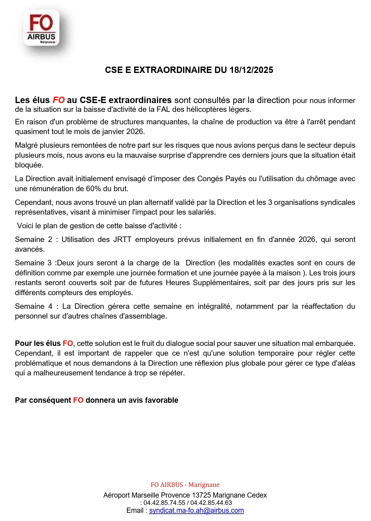 Pour la fin d’année ainsi que pour les quinze premiers jours de la rentrée, une baisse de charge est annoncée sur la FAL des hélicoptères légers. FO, en lien avec les autres organisations représentatives, s’est immédiatement mobilisée afin de trouver, en moins de 24 heures, un compromis permettant un accompagnement optimal des salariés concernés.